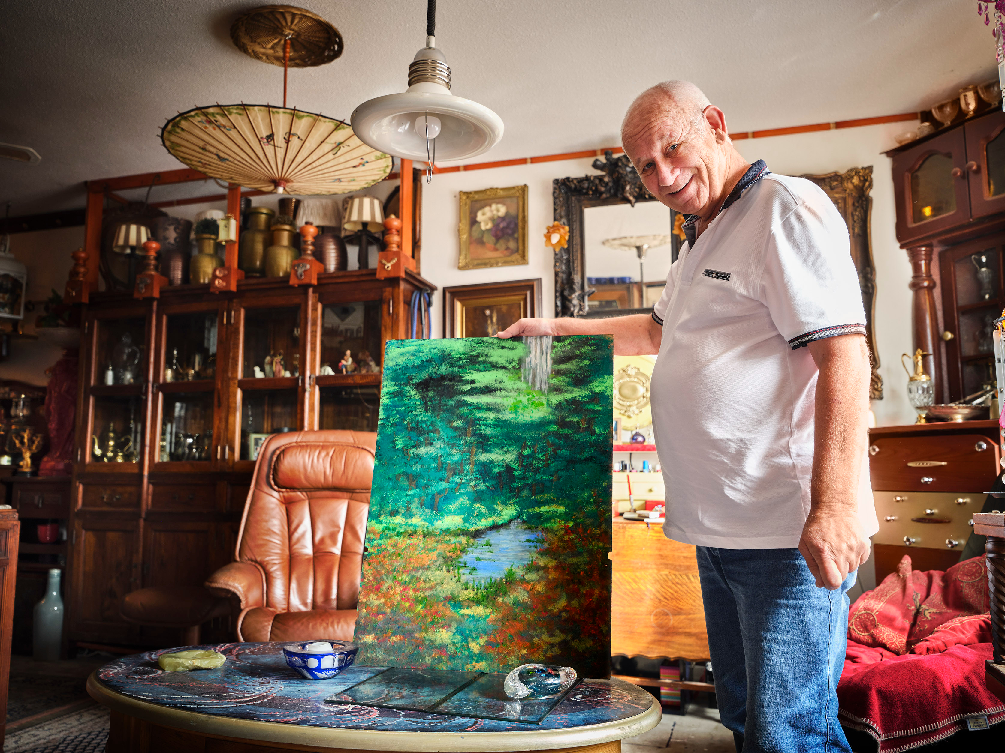 "Onvoorstelbaar wat mensen allemaal weggooien", zegt Ron. "Meubels, elektronica, lampen… Wat ik kan dragen en waar ik iets mee kan, neem ik mee. Meestal sloop ik het en maak ik van de onderdelen iets nieuws. Dat knutselen vind ik het leukste." Zo heeft hij veel ornamenten gemaakt van de voet van een schemerlamp en glas van kroonluchters. Maar hij heeft ook grotere bouwwerken, met als basis een eikenhouten tafel. Die worden regelmatig veranderd en geschilderd.
