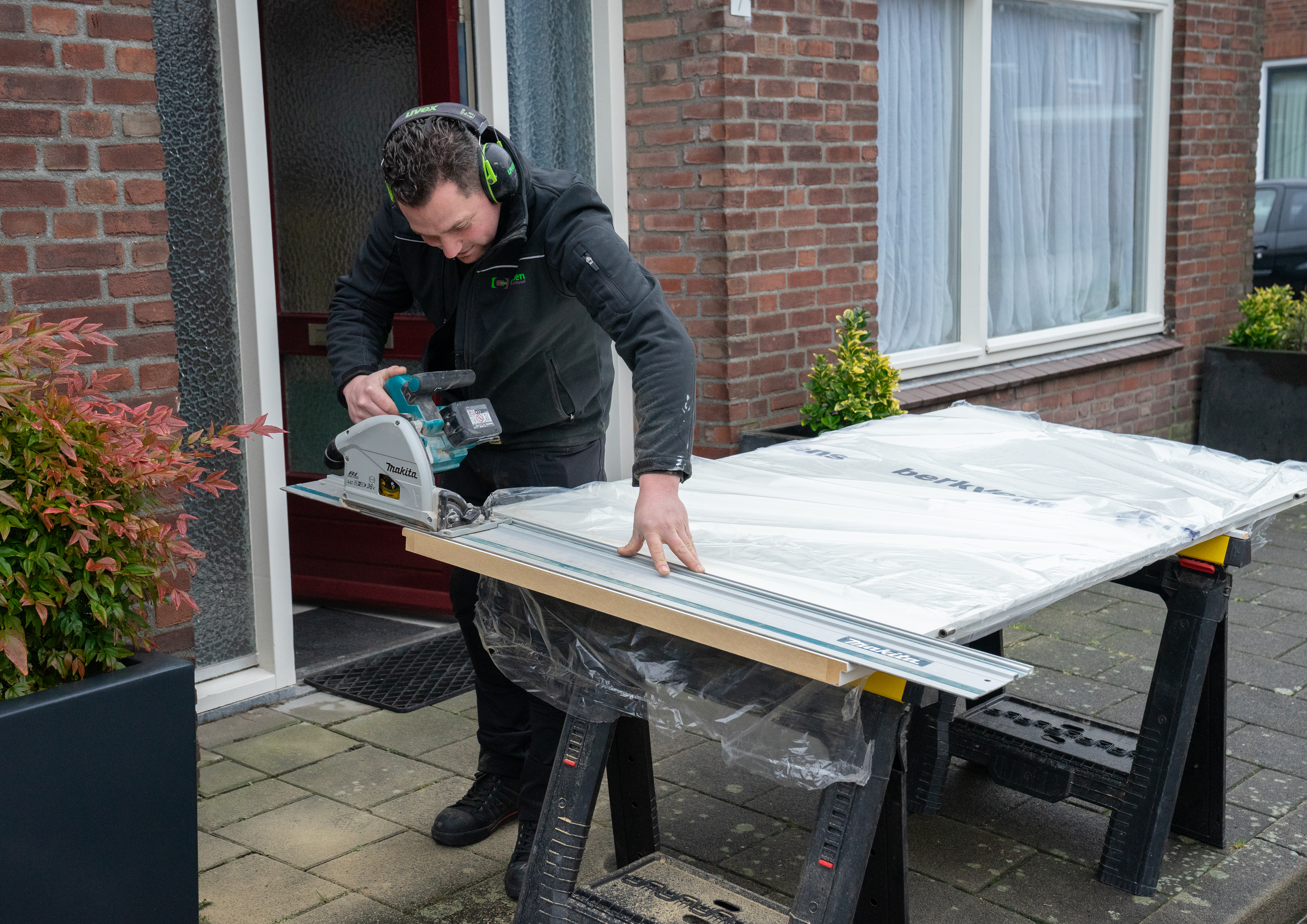 Voordat we vertrekken naar de volgende klus, stopt er een vrachtwagen van Groenen. Patrick krijgt een lang pakket mee. "De nieuwe plint die ik bij het volgende adres nodig heb", zegt Patrick. Hij legt het pakket in zijn bus en we rijden door naar een woning in Tivoli. De nieuwe bewoonster woont daar 5 weken en er wordt nog wat opgeknapt. Zo ook de keuken. Patrick haalt voorzichtig de apparatuur weg en trekt de oude plint los. Na het opmeten, zaagt hij buiten de nieuwe plint op maat. Hij zet er bevestigingshaken op en plaatst de plint onder het keukenblok. Past precies!