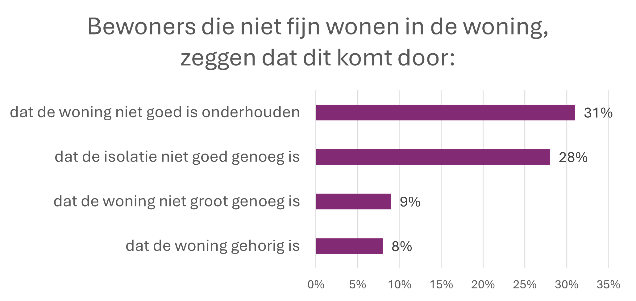 Bewoners zeggen vaker, dan vorig jaar, dat ze fijn wonen doordat de woning ruim genoeg is. Bewoners die niet fijn wonen zeggen vaker, dan vorig jaar, dat dit komt doordat de woning geen goede isolatie heeft. Er wordt ook vaker gezegd dat bewoners niet fijn wonen door schimmel en lekkage (6%).