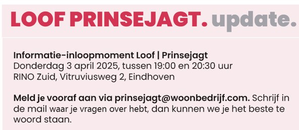 Er gebeurt veel in Prinsejagt. We kunnen ons voorstellen dat je daar vragen over hebt. Stuur dan een mail aan prinsejagt@woonbedrijf.com. Vergeet niet om je eigen gegevens er bij te zetten. Je kunt ook bellen met Woonbedrijf: 040 2 43 43 43.