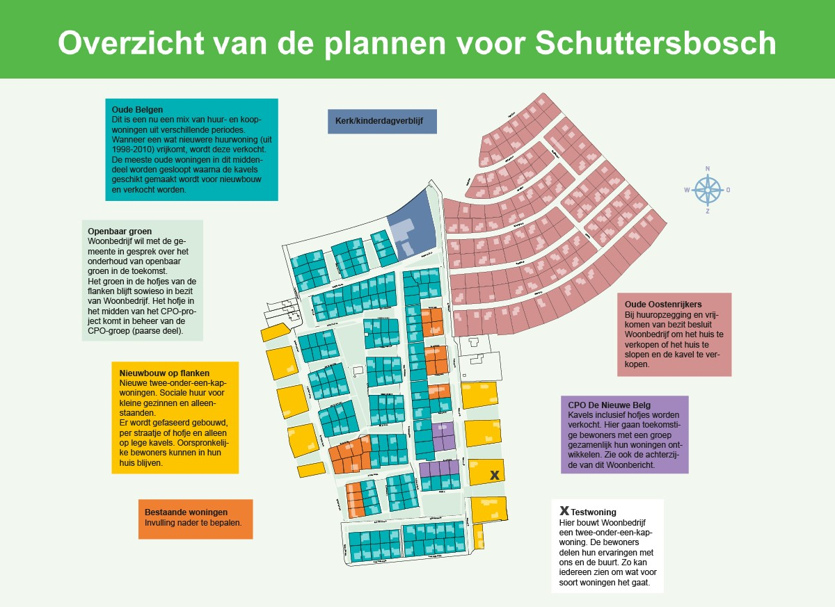 Het belangrijkste is dat het groene karakter van de buurt blijft behouden en er tegelijk ruimte komt voor nieuwe bewoners, zowel huurders als kopers. We kiezen voor een combinatie van nieuwbouw en verkoop van woningen die vrijkomen. De verhouding zal uiteindelijk ongeveer 40% huur en 60% koop worden. Al eerder maakten we afspraken met de oorspronkelijke huurders. Zij mogen zo lang zij willen in hun woning in Schuttersbosch blijven. Aan die afspraak verandert niets.