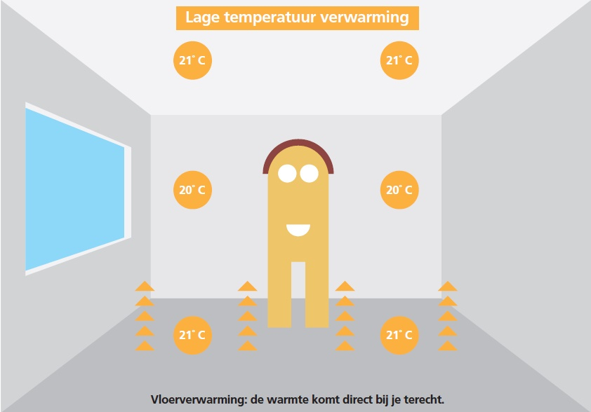 Vloerverwarming werkt op een lagere temperatuur dan radiatoren. Het water in de vloer is tussen de 25°C en 45°C. De warmtepomp werkt het beste als de temperatuur stabiel blijft.