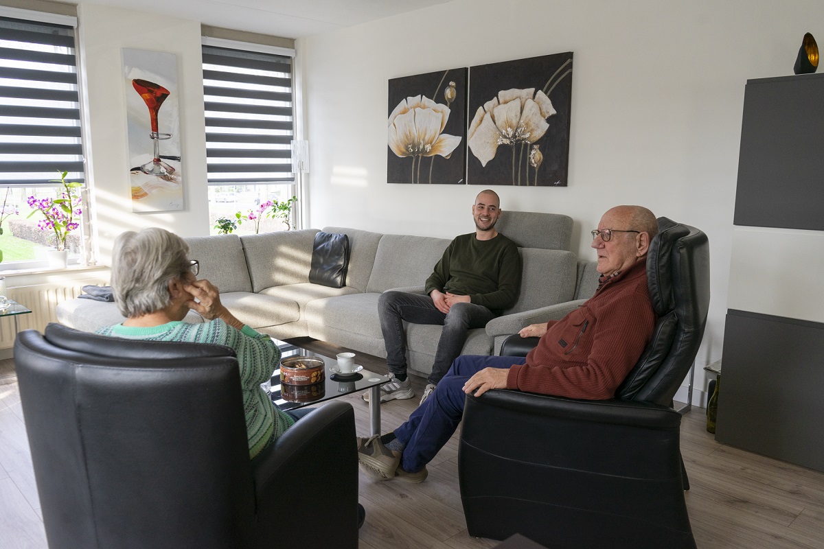 Chris maakt een praatje met Henk en Riet. Zij verhuisden in september vorig jaar naar een appartement in Mensfort. Hiervoor woonden ze 52 jaar in een eengezinswoning in Woensel. "Maar traplopen ging steeds moeilijker", zegt Henk. "Nu wonen we gelijkvloers en het gebouw heeft een lift, da's ideaal." Het stel woonde al eerder in Mensfort, voordat ze naar Woensel verhuisden. "De wijk is natuurlijk veel veranderd", zegt Riet. Ze lacht. "In de kerk waar onze jongste dochter is gedoopt, zit nu een ALDI." Een bijzonder weetje: hun onderburen van toen zien ze nog steeds. "Zij wonen hier vlakbij", zegt Henk. "Na 55 jaar hebben we nog steeds contact."