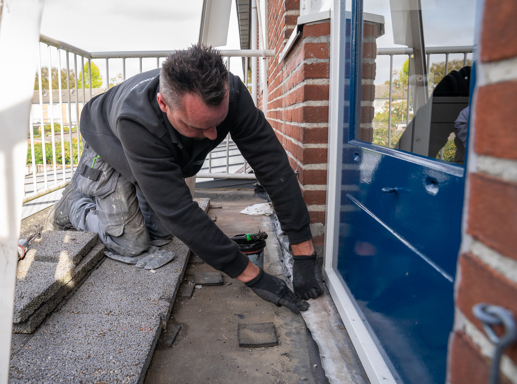 De eerste klus deze ochtend is in een woning in Woensel-Noord. De bewoners hebben een lekkage. Na hun vakantie troffen ze een muur in de keuken nat en zwart van de schimmel aan. Aan Ferdy de taak om het lek op te sporen en te verhelpen. Hij vindt de oorzaak snel: de dakbedekking van de slaapkamer naar het balkon erboven is te kort. Daardoor loopt regenwater in en langs de muur naar beneden, de keuken in. Ferdy kan het snel maken. Hij verlengt de dakbedekking en werkt het netjes af. "Niet alle lekkages zijn zo makkelijk te vinden en op te lossen. Gisteren had ik er een waarbij de koelkast eruit moest en ik de muur open moest breken. De loodgieter kwam en daarna moest alles weer gemaakt worden."