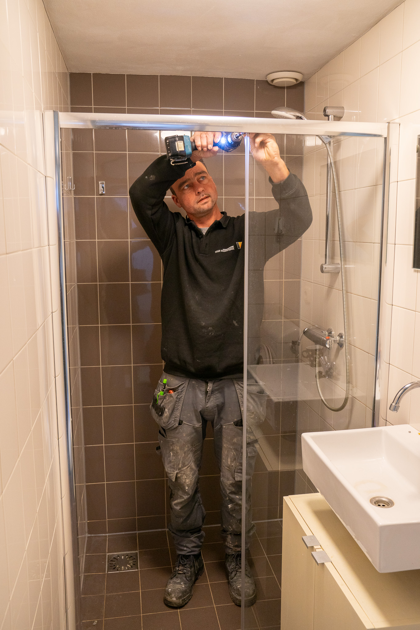 Het mooie aan zijn werk vindt Ferdy dat hij mensen kan helpen. "En het is altijd een verrassing wat je tegenkomt. Soms staat er in onze tablet meer informatie over een klus, soms niet. Of het blijkt om iets anders te gaan dan er staat." Zo is deels het geval bij het volgende adres. Ook deze woning heeft een lekkage, in de badkamer. De opdracht is om de douche te kitten. Maar ook de glazen wanden blijken weggehaald en moeten worden teruggezet.