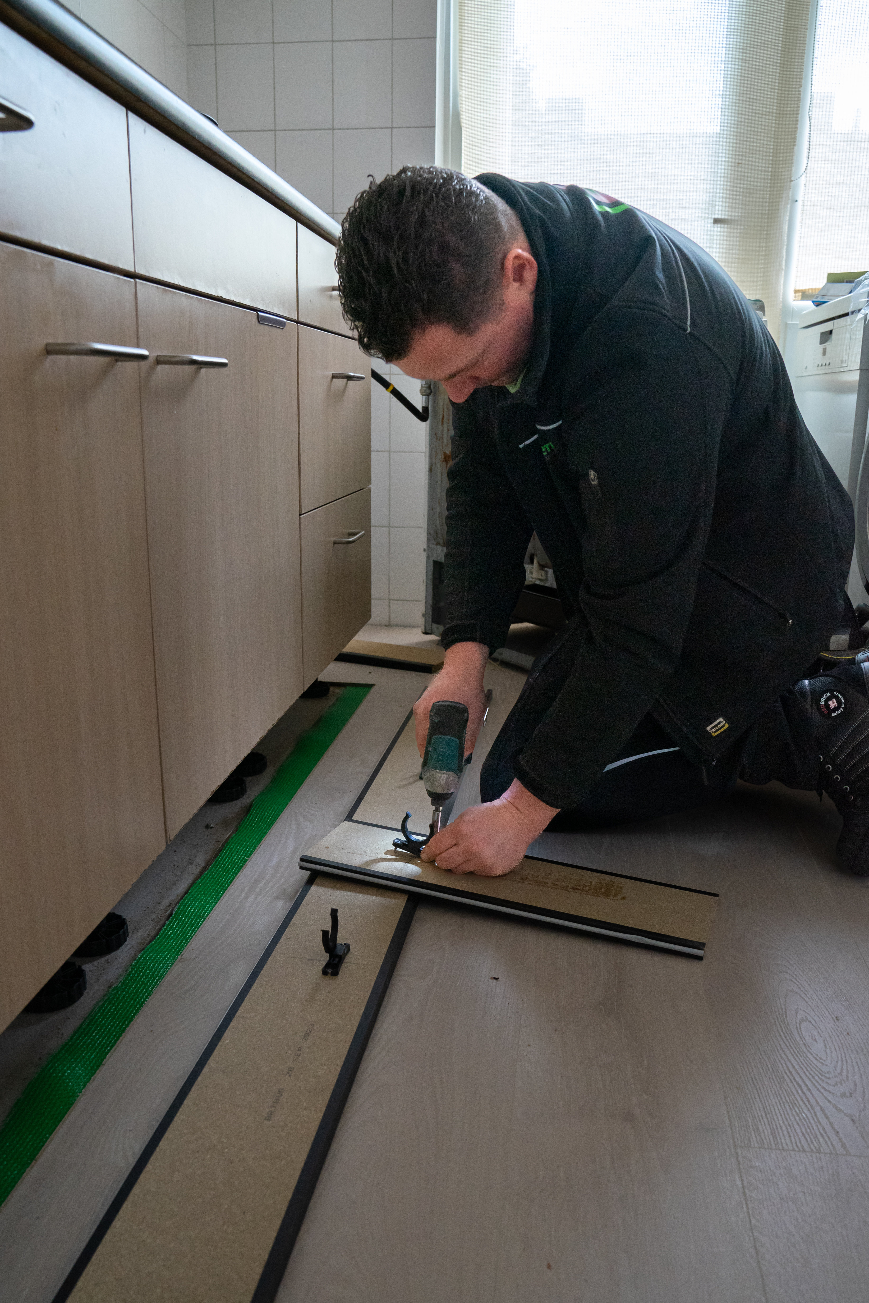 Voordat we vertrekken naar de volgende klus, stopt er een vrachtwagen van Groenen. Patrick krijgt een lang pakket mee. "De nieuwe plint die ik bij het volgende adres nodig heb", zegt Patrick. Hij legt het pakket in zijn bus en we rijden door naar een woning in Tivoli. De nieuwe bewoonster woont daar 5 weken en er wordt nog wat opgeknapt. Zo ook de keuken. Patrick haalt voorzichtig de apparatuur weg en trekt de oude plint los. Na het opmeten, zaagt hij buiten de nieuwe plint op maat. Hij zet er bevestigingshaken op en plaatst de plint onder het keukenblok. Past precies!