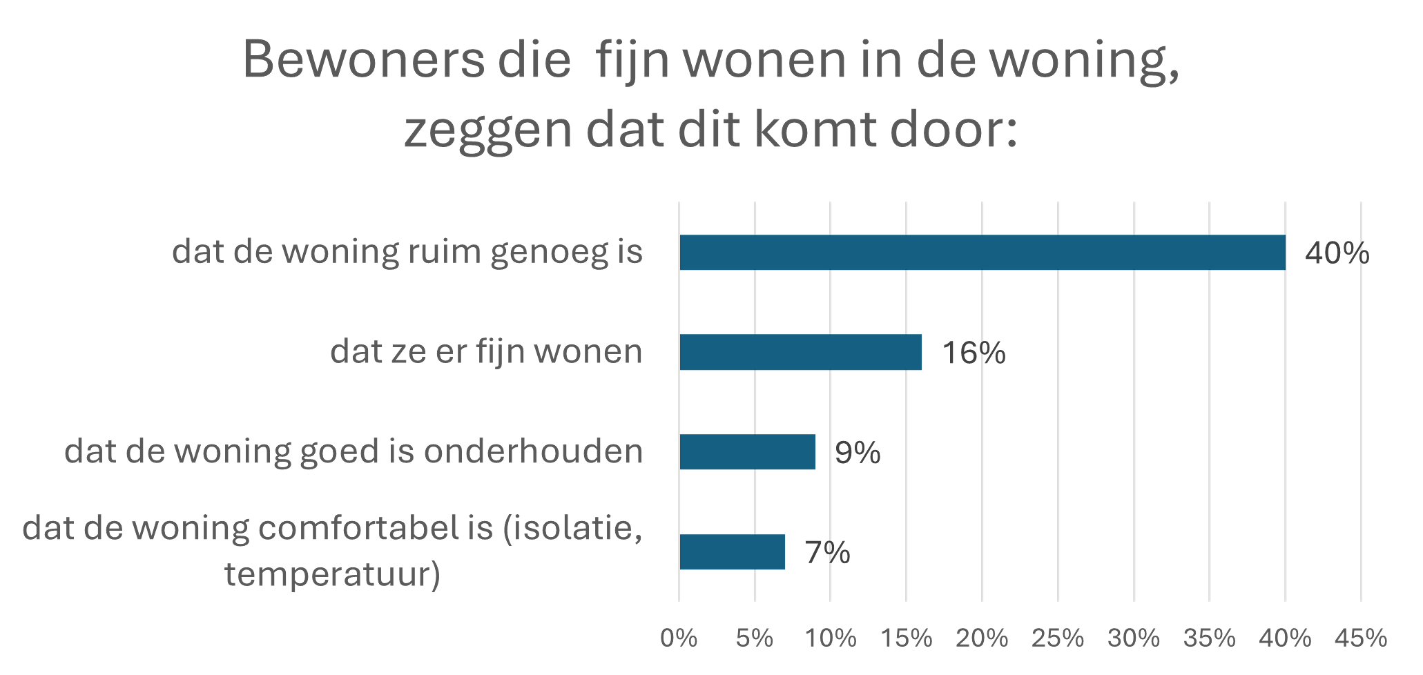 Bewoners zeggen vaker, dan vorig jaar, dat ze fijn wonen doordat de woning ruim genoeg is. Bewoners die niet fijn wonen zeggen vaker, dan vorig jaar, dat dit komt doordat de woning geen goede isolatie heeft. Er wordt ook vaker gezegd dat bewoners niet fijn wonen door schimmel en lekkage (6%).
