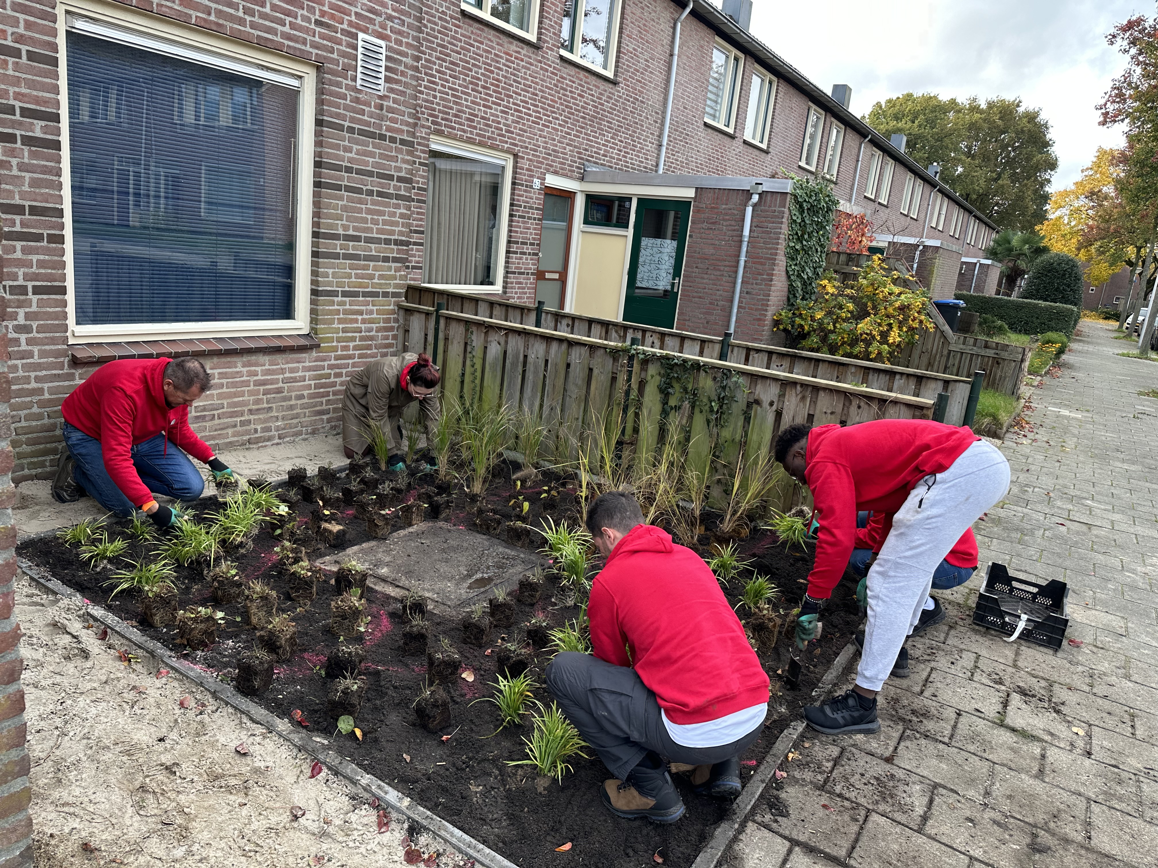 De nieuwe tuinen zorgden voor een grote glimlach bij de 3 bewoners. Zij zijn erg blij en dankbaar. En het buiten bezig zijn, zorgde voor verbinding tussen bewoners, vrijwilligers en de aanwezige organisaties. Extra gezellig met wat te drinken en iets lekkers van de Buurtbus van WIJeindhoven. Bewoners van de Tomatenstraat konden ook genieten van een lunch in De Huiskamer. Verzorgd door vrijwilligster Halima en de firma Edwards. Het was een mooie, actieve en groene dag! Dankjewel aan iedereen die geholpen heeft!
