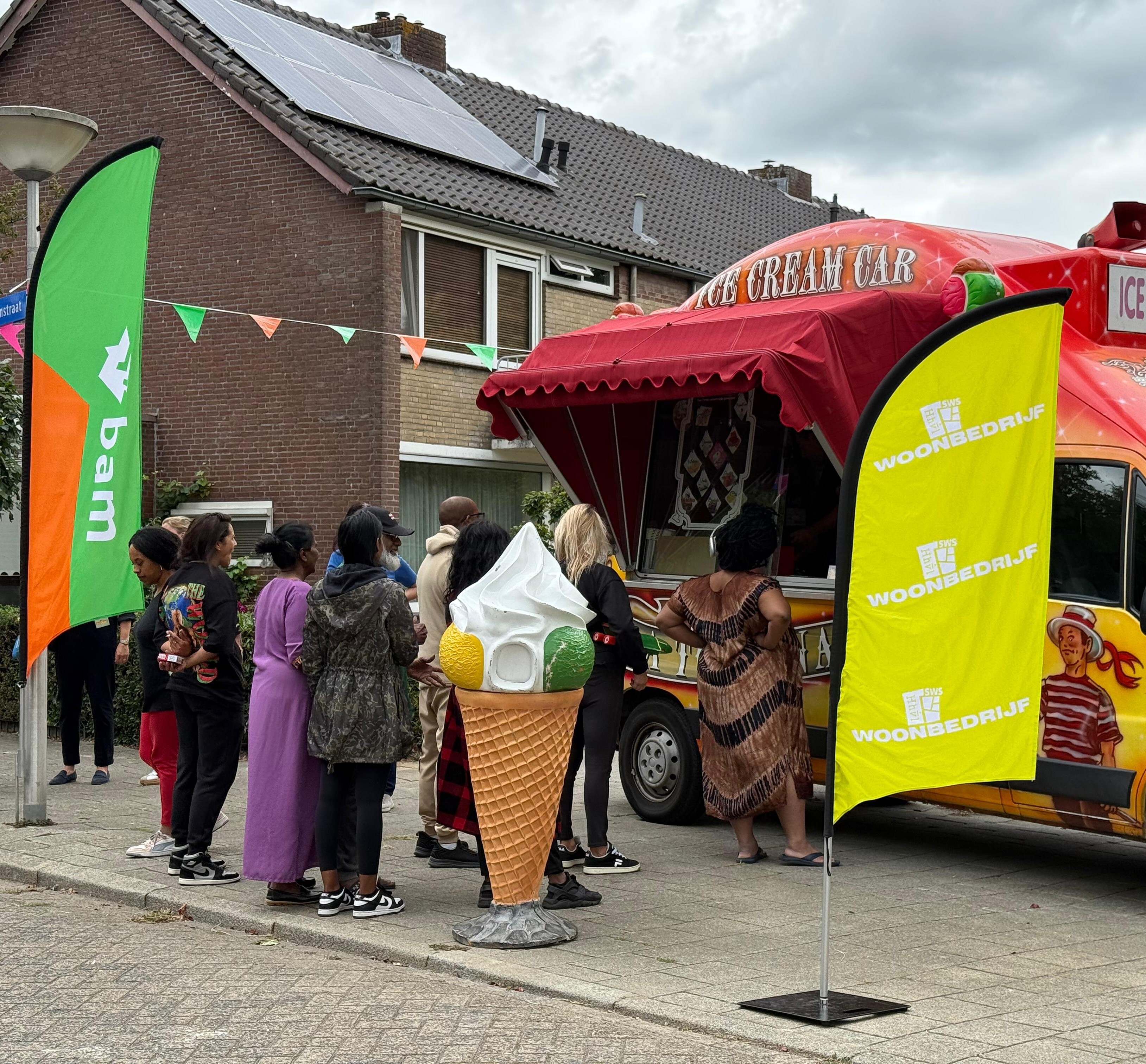 De start van de renovatie werd gevierd met een feestelijke aftrap in de wijk. Bewoners kwamen samen tijdens een opruimdag, waar naast het plaatsen van het bouwbord ook een ijscokar (uiteraard mét aardbeienijs) voor een zomerse sfeer zorgde. Daarmee is een vliegende start gemaakt voor een traject dat niet alleen woningen verduurzaamt, maar ook de leefbaarheid in de wijk vergroot.
