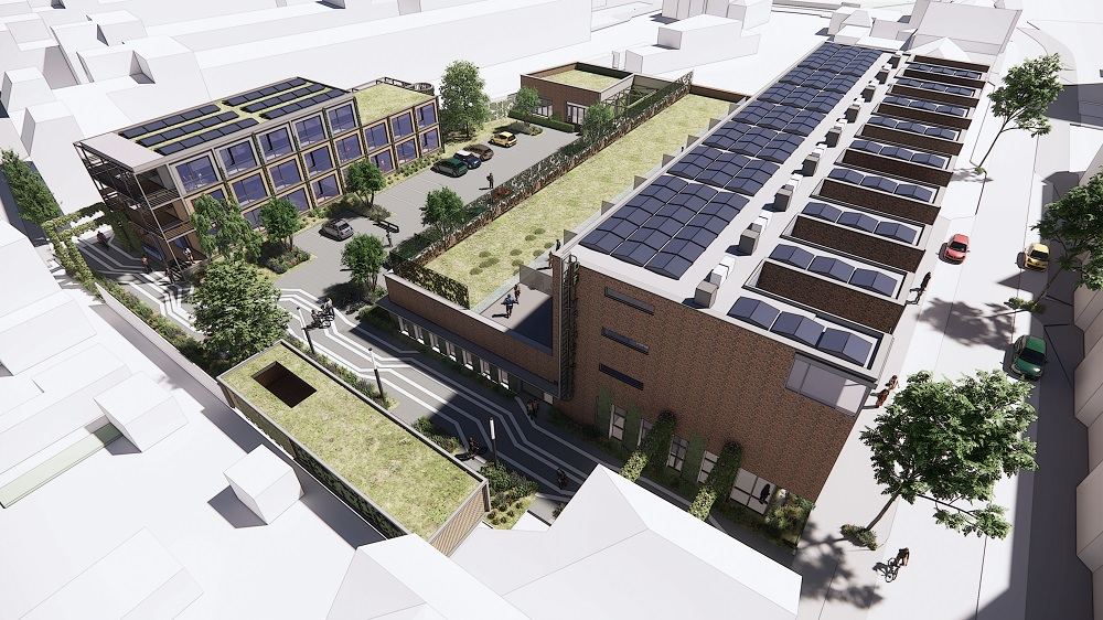 Het totale plan met linksboven de prefab studio's en rechts het gebouw met op de begane grond de studio's die in de oude supermarkt komen.